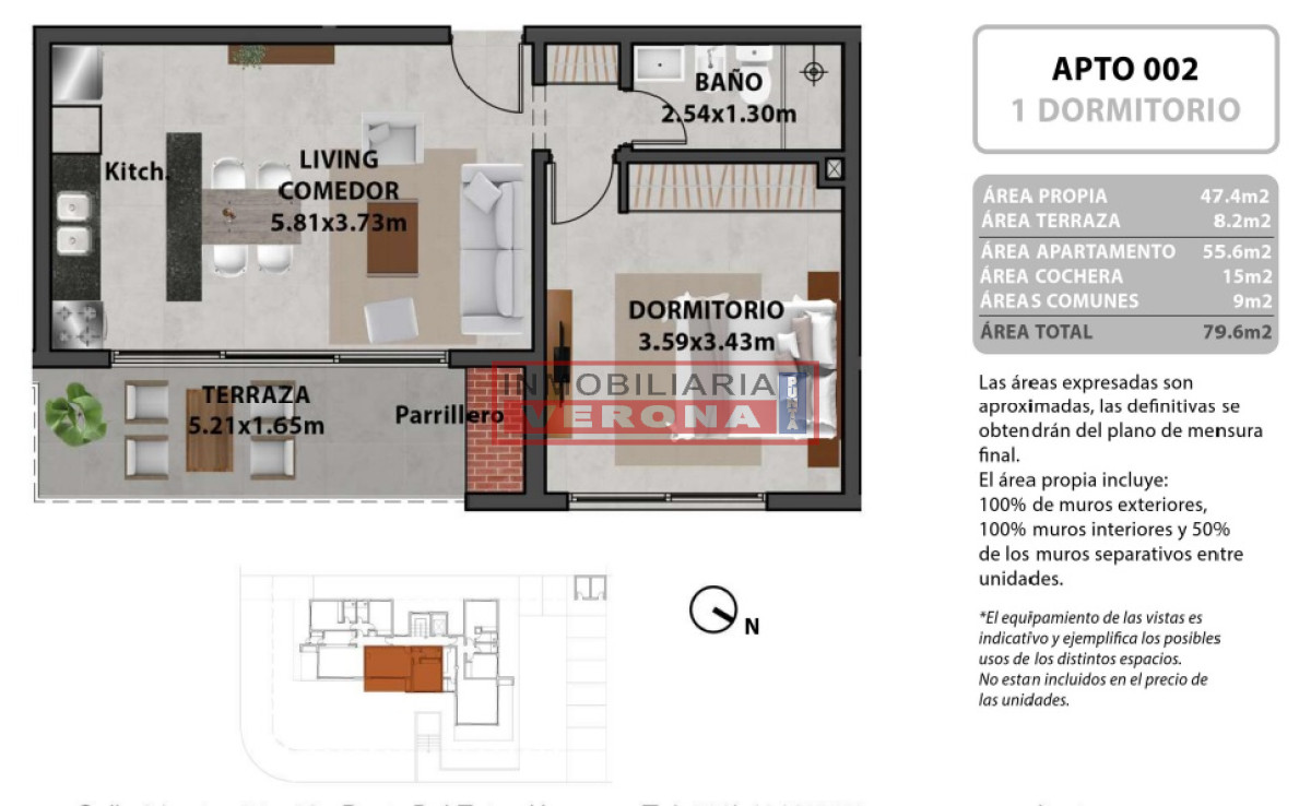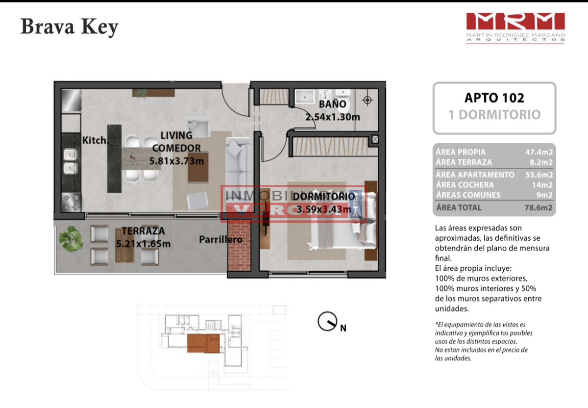 La unidad promocionada en esta publicación cuenta con living comedor con amplios ventanales que conectan con el balcón terraza con parrillero propio, 1 dormitorio, 1 baño. Tiene una superficie de aprox. 55,6 m2 propios (incluye balcón, muros y ductos) y 78,6 m2 totales (incluye areas comunes y cochera). Muy buena orientación solar. El precio incluye cochera para un auto. El edificio cuenta con un total de tan solo 9 unidades. Gastos comunes bajos!