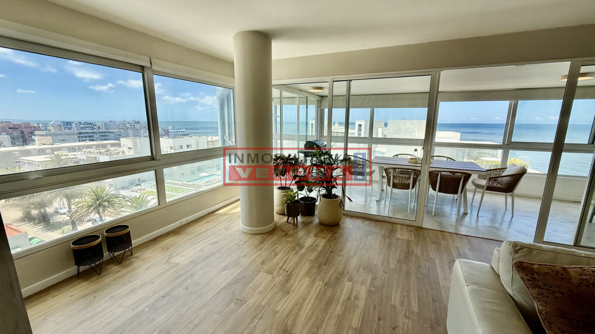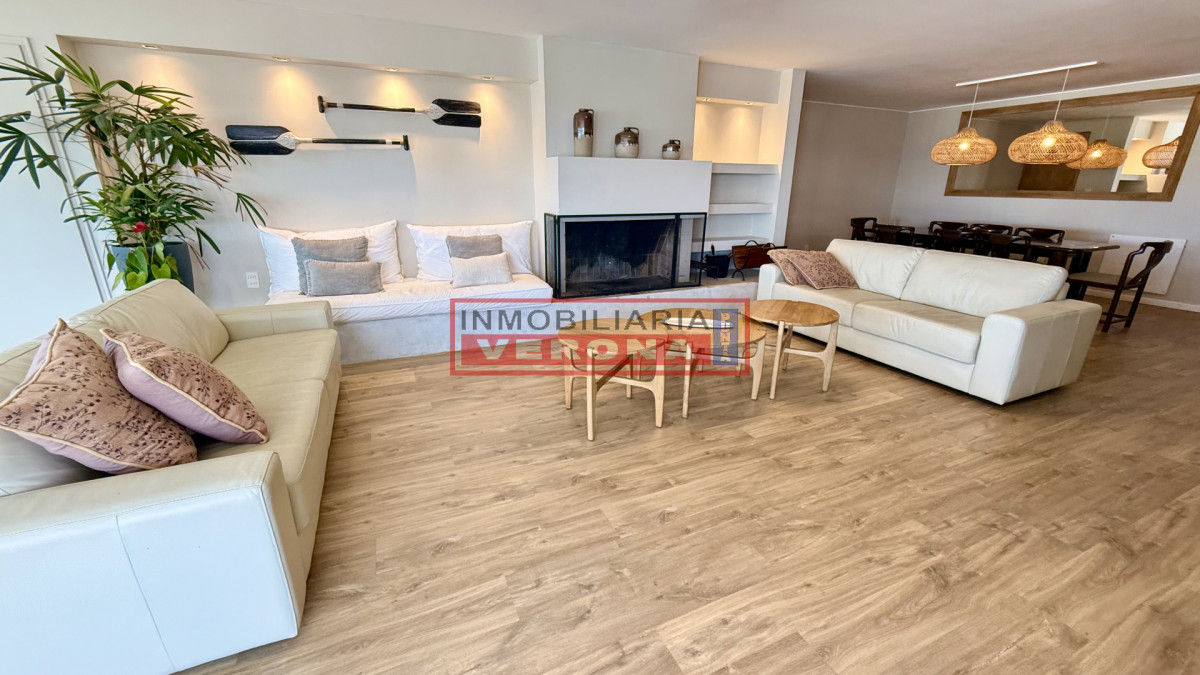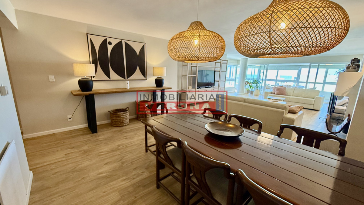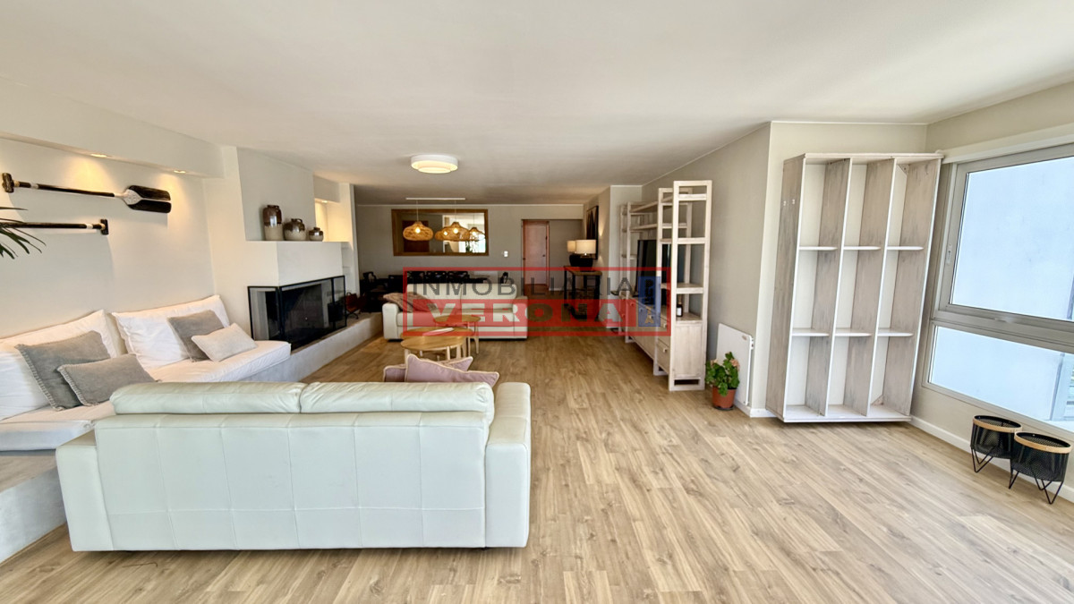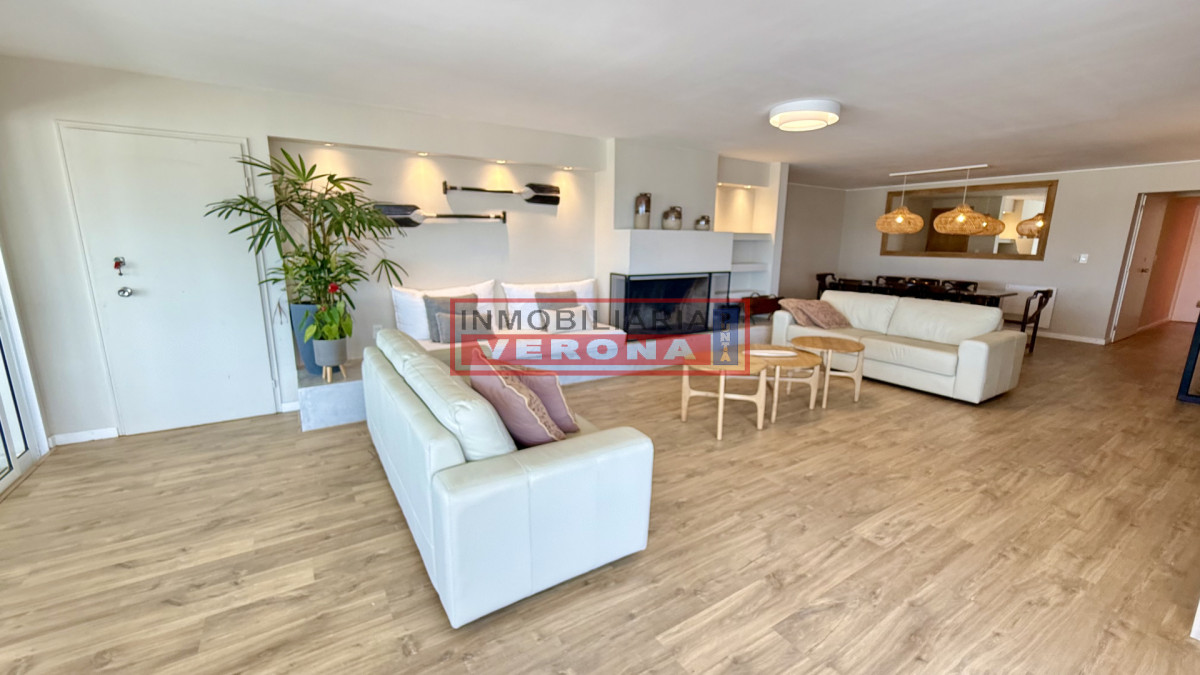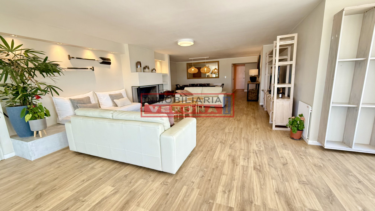 Amplio apartamento de 200m2 completamente reciclado y con hermosas vistas. Generosa recepción con estufa leña y terraza integrada. 3 dormitorios, 3 baños (todos en suite), todos viendo el amanecer y recibiendo sol gran parte del día, amplia cocina con breakfast, lavadero y dependencia de servicio con baño. Cuenta además con doble garaje en subsuelo. El edificio ofrece recepción 24hs, piscina exterior climatizada, cancha de tennis, 2 saunas secos, vestuarios, salón para fiestas, parrillero equipado, servicio de playa y servicio de mucama (optativo).