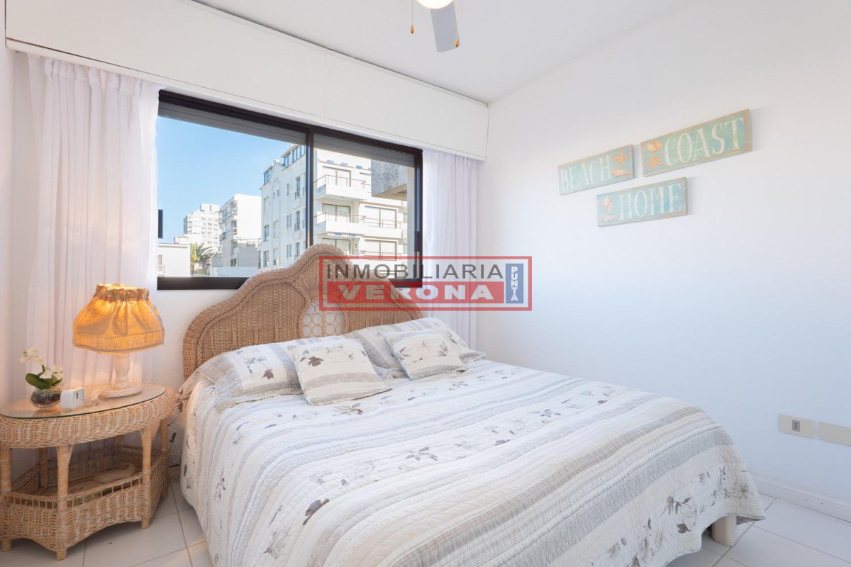 Apartamento ubicado en península de punta del este con vista al mar, excelente ubicación, con servicio y a pasos de playa el emir. Cuenta con amplio living comedor, con terraza cerrada, cocina definida, 2 dormitorios, 2 baños y cochera. El edificio cuenta con servicio de mucama, 2 veces por semana en invierno, todos los días en verano, parrillero techado, piscina, gimnasio y sauna.
