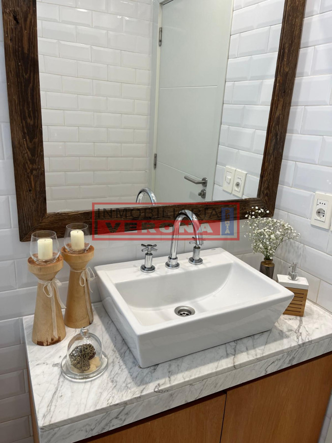 El área social se destaca por su amplio living comedor, con grandes ventanales que integran el interior con el jardín y permiten disfrutar de la luz del día en todo momento. La cocina está completamente equipada, con muebles funcionales, campana, horno, microondas, anafe, heladera con freezer y espacio de guardado tanto en cocina como en comedor.